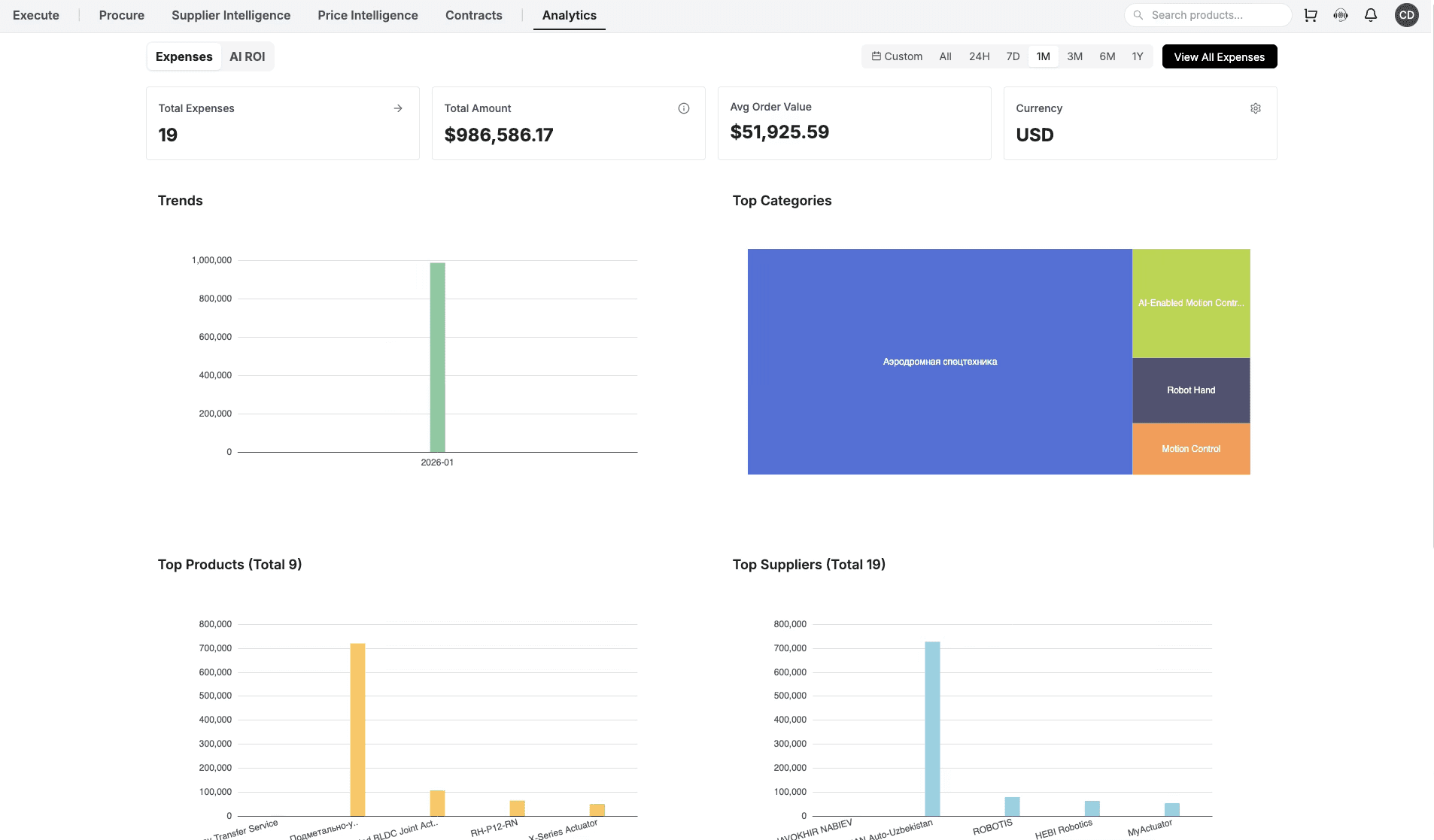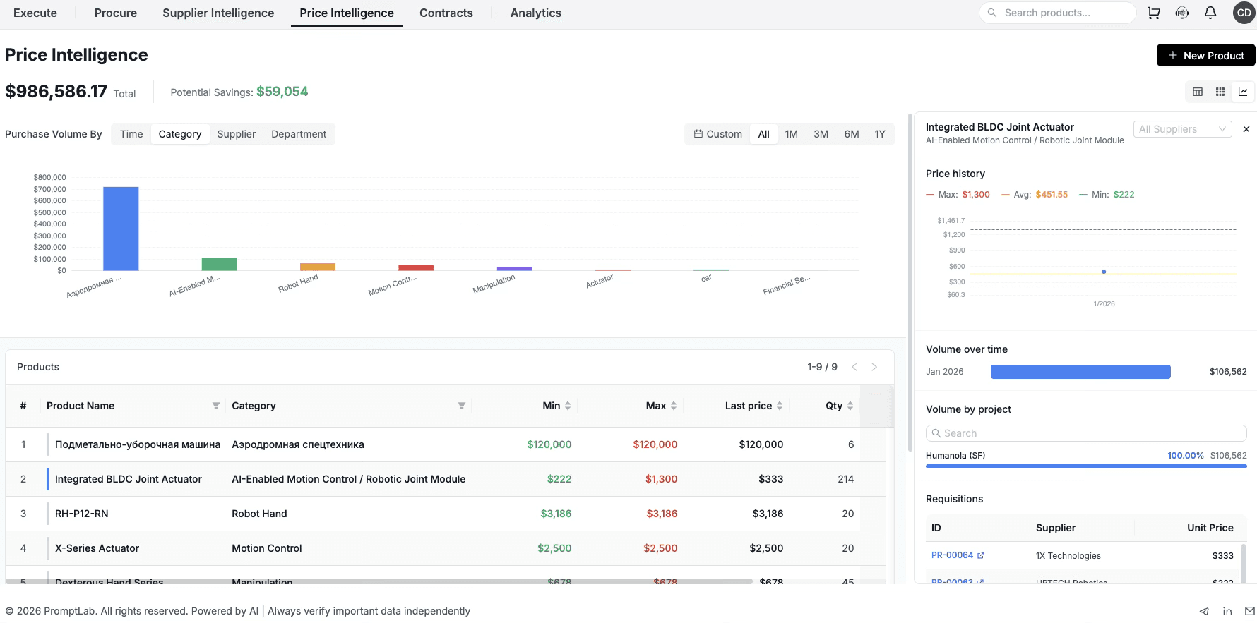 Compare min, max, and average prices across suppliers, time, and categories to spot variance early.