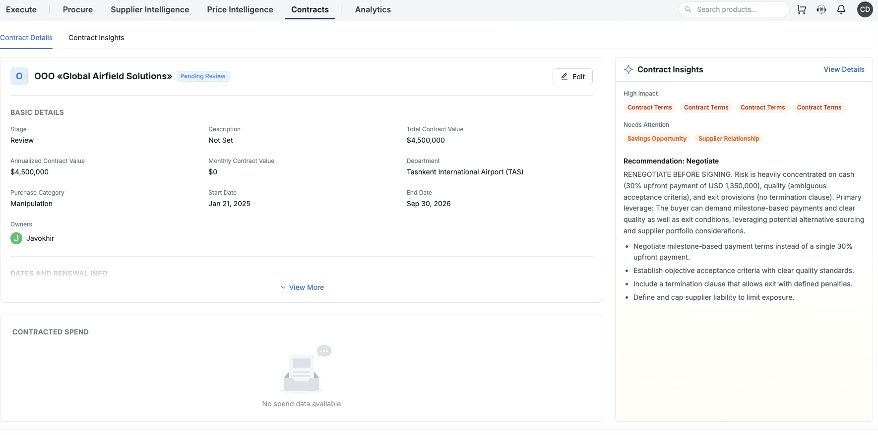 See contract value, risk, and negotiation opportunities before issues turn into cost.